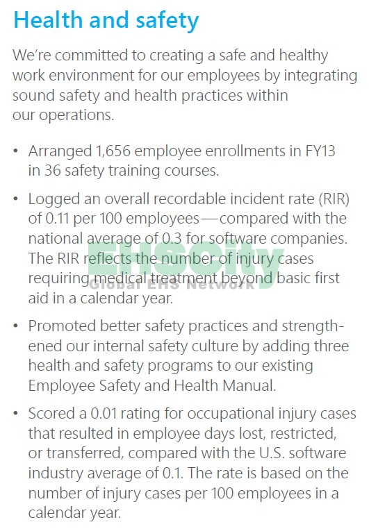 Health and Safety Performance, Microsoft Corporate Citizenship Environmental Sustainability2013
