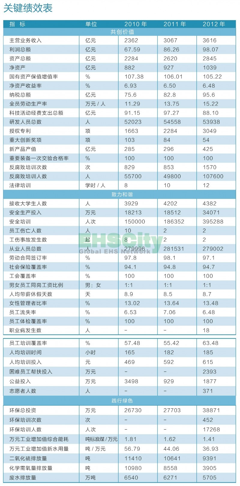 關(guān)鍵績(jī)效表,中國(guó)兵器工業(yè)集團(tuán)公司2012年度企業(yè)社會(huì)責(zé)任