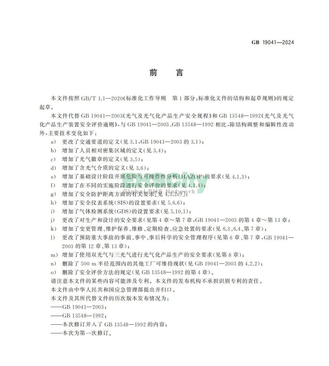 該標(biāo)準(zhǔn)在吸取涉光氣典型事故教訓(xùn)基礎(chǔ)上,聚焦重大安全風(fēng)險防控,規(guī)定了光氣及光氣化產(chǎn)品生產(chǎn)裝置的規(guī)劃布局、設(shè)計、生產(chǎn)運行、應(yīng)急處置等安全要求,增加了使用雙光氣與三光氣進行光氣化產(chǎn)品生產(chǎn)、安全儀表系統(tǒng)和氣體檢測系統(tǒng)的設(shè)置等安全要求,并整合了《光氣及光氣化產(chǎn)品生產(chǎn)裝置安全評價通則》(GB 13548)的技術(shù)內(nèi)容。