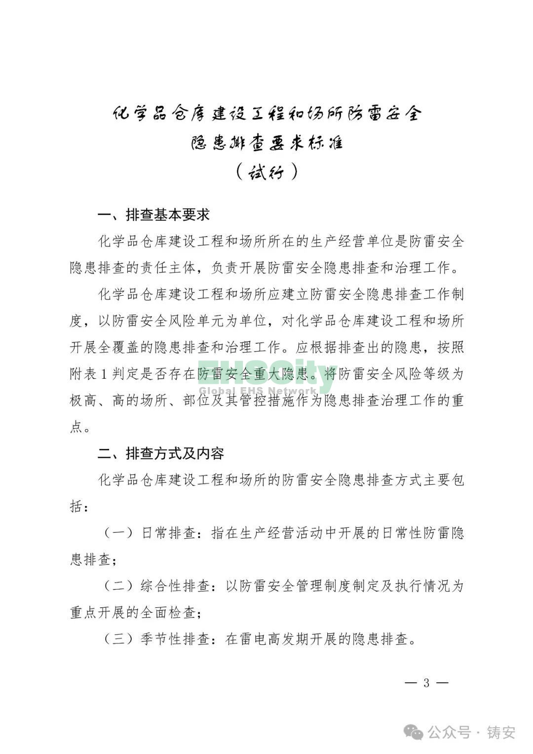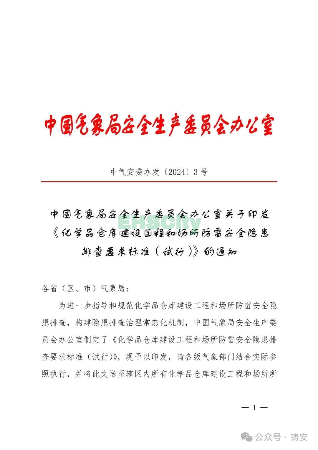 中國(guó)氣象局安委會(huì)印發(fā)《化學(xué)品倉(cāng)庫(kù)建設(shè)工程和場(chǎng)所防雷安全隱患排查要求標(biāo)準(zhǔn)(試行)》的通知