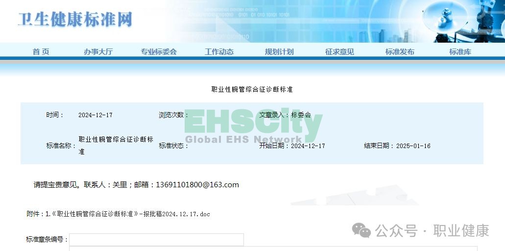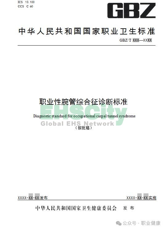 前 言 本標準為推薦性標準。 本標準由國家衛(wèi)生健康標準委員會職業(yè)健康標準專業(yè)委員會負責技術審查和技術咨詢,由中國疾病預防控制中心負責協(xié)調性和格式審查,由國家衛(wèi)生健康委職業(yè)健康司負責業(yè)務管理、法規(guī)司負責統(tǒng)籌管理。 本標準起草單位:北京大學第三醫(yī)院、北京積水潭醫(yī)院、中國疾病預防控制中心職業(yè)衛(wèi)生與中毒控制所、深圳市職業(yè)病防治院、貴州省第三人民醫(yī)院、湖北省中西醫(yī)結合醫(yī)院(湖北省職業(yè)病醫(yī)院)。本標準主要起草人:李樹強、陳山林、薛云皓、王忠旭、王成、張乃興、黎東霞、凌瑞杰、關里、賈寧。職業(yè)性腕管綜合征診斷標準 1 范圍 本標準規(guī)定了職業(yè)性腕管綜合征的診斷原則及診斷。 本標準適用于制造業(yè)工人長時間從事腕部重復作業(yè)或用力作業(yè)所致腕管綜合征的診斷。2 規(guī)范性引用文件 下列文件中的內容通過文中的規(guī)范性引用而構成本標準必不可少的條款。其中,注日期的引用文件,僅該日期對應的版本適用于本標準;不注日期的引用文件,其最新版本(包括所有的修改單)適用于本標準。 GBZ/T 157 職業(yè)病診斷名詞術語 GBZ/T 265 職業(yè)病診斷通則3 術語和定義 GBZ/T 157 界定的以及下列術語和定義適用于本標準。3.1 職業(yè)性腕管綜合征 occupational carpal tunnel syndrome,OCTS 手及腕部長時間從事重復作業(yè)或用力作業(yè)后,引起手部正中神經(jīng)支配區(qū)域出現(xiàn)感覺或運動障礙。 注:主要表現(xiàn)為手部拇指、示指、中指和環(huán)指橈側感覺異常(麻木、疼痛),部分患者會出現(xiàn)前臂疼痛,嚴重者還會出現(xiàn)大魚際肌萎縮、拇指不能完成對掌等功能障礙。3.2 腕部重復作業(yè) wrist repetitive work 勞動者從事腕部屈曲(≥15°)、背伸(≥15°)、橈尺偏(≥15°)或上述復合動作作業(yè)的動作重復頻率≥4??次/min,且該作業(yè)活動的累計工時≥4?h/d。 注:腕部屈曲(≥15°)、背伸(≥15°)、橈尺偏(≥15°)的角度,均為相對于手腕部自然中立位(0°)的屈曲、背伸和橈尺偏角度。3.3 腕部用力作業(yè) wrist forceful work 勞動者從事腕部屈曲、背伸、橈尺偏或上述復合動作作業(yè)時,手部抓握工具或物品的重量≥4? ?kg,且該作業(yè)活動的累計工時≥4 ?h/d。4 診斷原則 根據(jù)連續(xù)3年及以上患側手腕部從事重復作業(yè)或用力作業(yè)的職業(yè)史,手部正中神經(jīng)支配區(qū)域出現(xiàn)感覺或運動功能障礙的癥狀和體征,伴有神經(jīng)電生理檢查或腕部高頻超聲檢查異常,結合職業(yè)健康監(jiān)護和現(xiàn)場職業(yè)衛(wèi)生調查資料,綜合分析,排除其他原因所致類似疾病,方可診斷(見GBZ/T 265)。5 診斷 患側腕部從事重復作業(yè)或用力作業(yè)連續(xù)3年及以上職業(yè)史;手部正中神經(jīng)支配區(qū)域(拇指、示指、中指和環(huán)指橈側)麻木或疼痛,癥狀以該區(qū)域最明顯但不局限于此區(qū)域,嚴重者可出現(xiàn)運動障礙;體格檢查腕橫紋水平正中神經(jīng)叩擊試驗(Tinel征)陽性或屈腕試驗(Phalen征)或反屈腕試驗(反Phalen征)陽性。并具有下列兩種檢查表現(xiàn)之一: a) 神經(jīng)電生理檢查:正中神經(jīng)遠端誘發(fā)電位的潛伏期(distal motor latency, DML)≥4.5?ms,且相同距離正中神經(jīng)與尺神經(jīng)的潛伏期之差>0.4?ms;或示指至腕部正中神經(jīng)感覺傳導速度<40.0?m/s; b) 腕部高頻超聲檢查:橫斷面顯示腕管區(qū)內橢圓形的正中神經(jīng)呈扁平狀,近側正中神經(jīng)腫脹增粗;神經(jīng)外膜回聲增強,神經(jīng)束回聲減低,正常神經(jīng)橫斷面蜂巢樣結構模糊;測量豌豆骨水平正中神經(jīng)橫截面積(cross sectional area,CSA)大于等于12.3?。6 正確使用本標準的說明 參見附錄A。附 錄 A(資料性) 正確使用本標準的說明A.1 職業(yè)性腕管綜合征常見職業(yè)接觸 職業(yè)性腕管綜合征常見于船舶及相關裝置制造業(yè)、電子設備制造業(yè)、家具制造業(yè)、汽車制造業(yè)、生物藥品制造業(yè)、玩具制造業(yè)等行業(yè),多發(fā)于裝配工、搬運工等工種。其他制造業(yè)工人職業(yè)接觸符合腕部重復作業(yè)或用力作業(yè)定義,應診斷為職業(yè)性腕管綜合征。手傳振動作業(yè)所致腕管綜合征的診斷及處理見GBZ7。A.2 職業(yè)史計算 制造業(yè)工人出現(xiàn)本標準診斷原則中的臨床表現(xiàn)時,已有連續(xù)從事重復作業(yè)或用力作業(yè)3年及以上職業(yè)史。脫離重復作業(yè)或用力作業(yè)超過30?d后,不會發(fā)生職業(yè)性腕管綜合征。A.3 關于腕管綜合征檢查方法A.3.1 體格檢查 腕管綜合征常見體格檢查方法: a)正中神經(jīng)叩擊試驗(Tinel征):輕叩擊患者手掌屈側腕橫紋平面正中神經(jīng)走行區(qū)時,拇指、示指、中指、環(huán)指橈側部分出現(xiàn)麻木即為陽性; b)屈腕試驗(Phalen征):肘關節(jié)伸直時囑患者腕關節(jié)掌屈并維持60?s,出現(xiàn)拇指、示指、中指、環(huán)指橈側麻木刺痛即為陽性; c)反屈腕試驗(反Phalen征):囑患者手背伸,抓住檢查者的手,檢查者對其腕部按壓60?s,出現(xiàn)拇指、示指、中指、環(huán)指橈側麻木刺痛即為陽性。A.3.2 神經(jīng)電生理檢查 神經(jīng)電生理檢查對本病診斷有重要意義。腕管綜合征以正中神經(jīng)功能損害為主,應重點檢測正中神經(jīng)