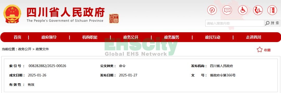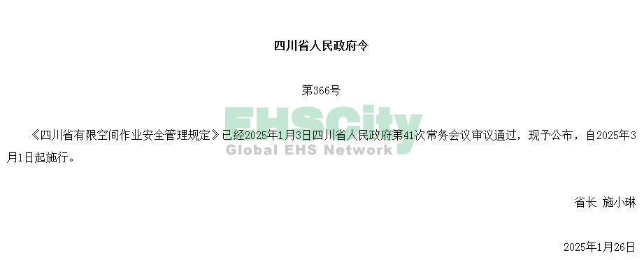近日,四川省人民政府第366號令公布了《四川省有限空間作業(yè)安全管理規(guī)定》,該規(guī)定自2025年3月1日起施行。