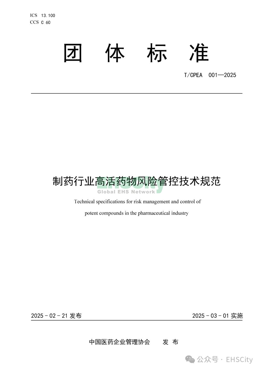 T/CPEA 001—2025 制藥行業(yè)高活藥物風(fēng)險(xiǎn)管控技術(shù)規(guī)范2025年3月1日實(shí)施