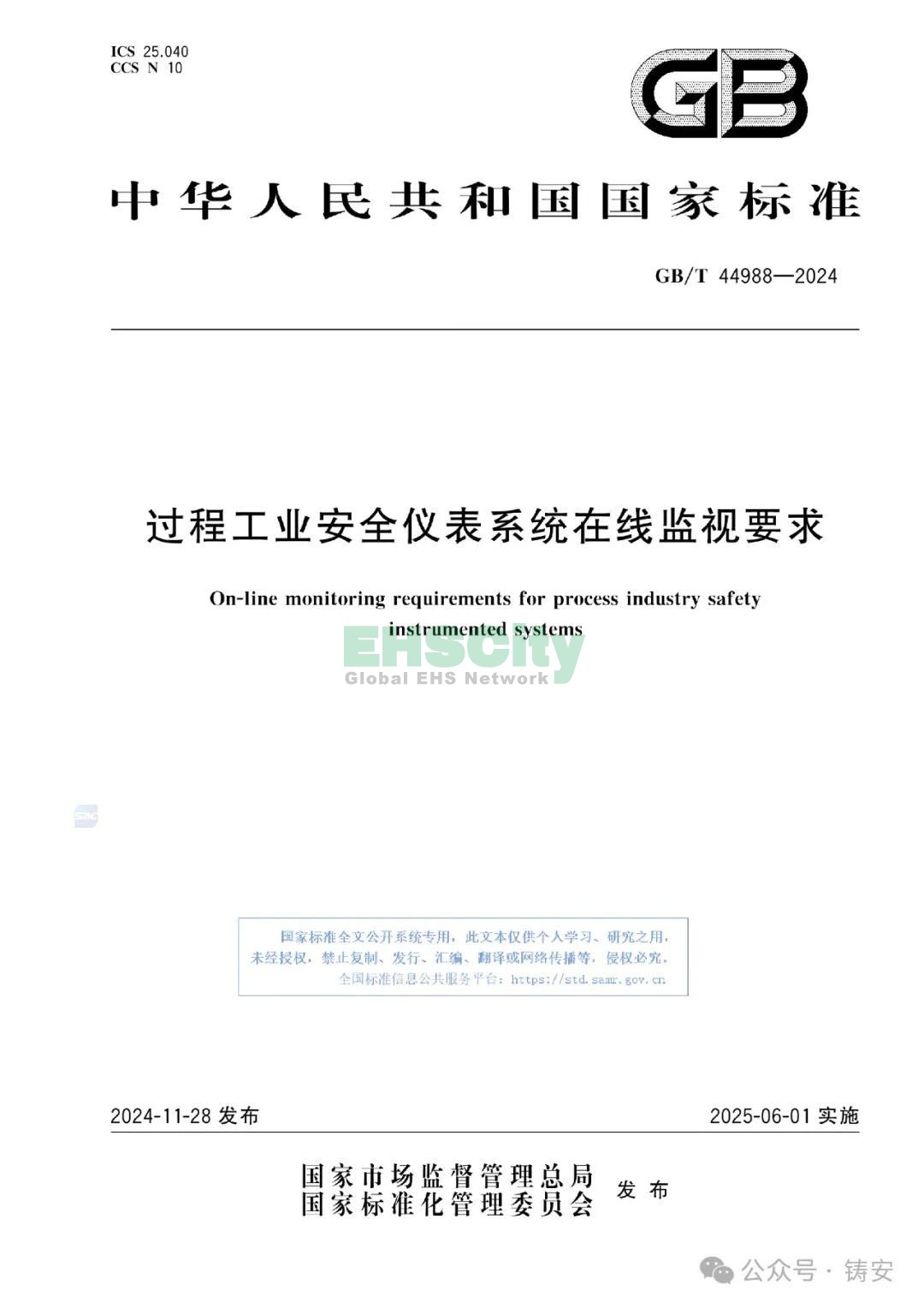 GB/T44988-2024 過程工業(yè)安全儀表系統(tǒng)在線監(jiān)視要求2025-6-1日實施