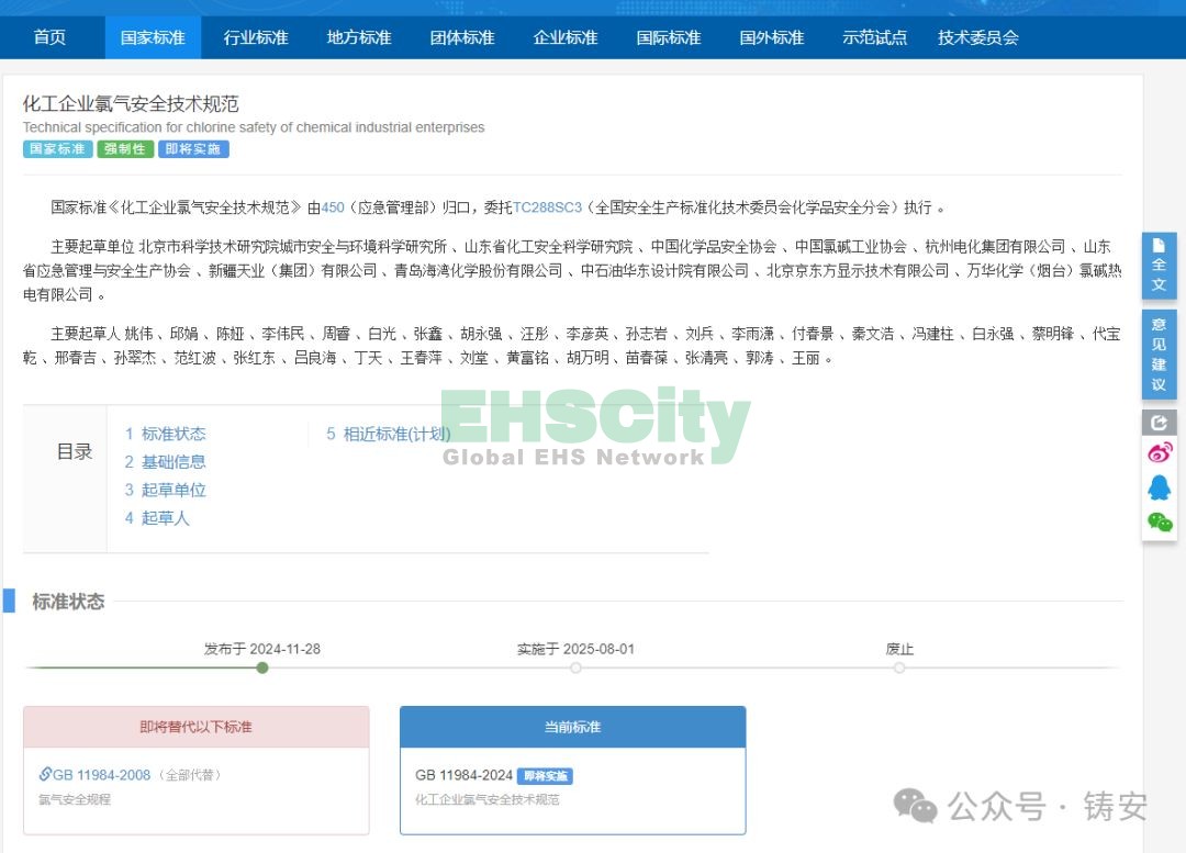 GB11984-2024 化工企業(yè)氯氣安全技術(shù)規(guī)范 已發(fā)布,將于2025年8月1日實施,該標準將替代GB 11984-2008《氯氣安全規(guī)程》