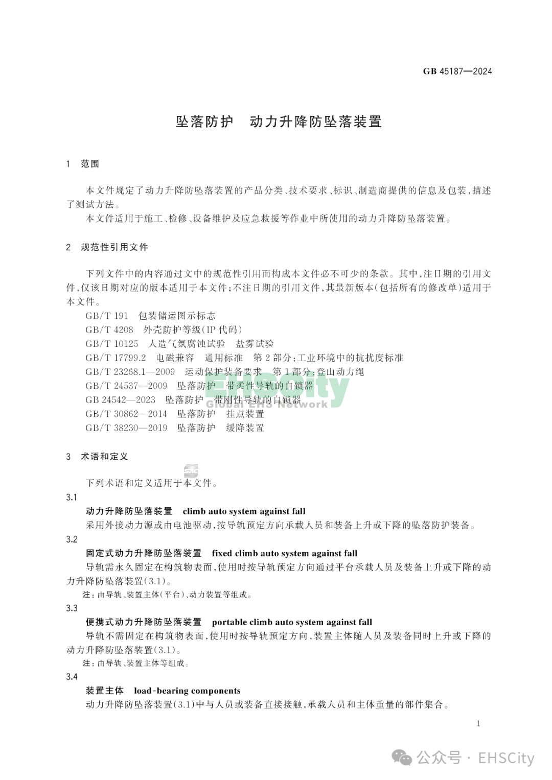 GB 45187-2024《墜落防護(hù) 動(dòng)力升降防墜落裝置》2026年1月1日實(shí)施