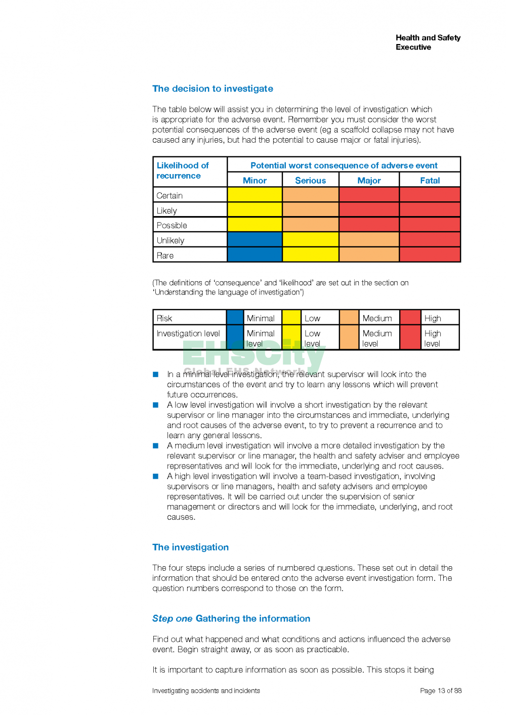 6. Investigate to determine the loss potential: The supervisor or leader needs to make a prompt appraisal of how serious the accident could have been and how likely it is to occur again. The individual can then decide how in-depth the investigation should be.