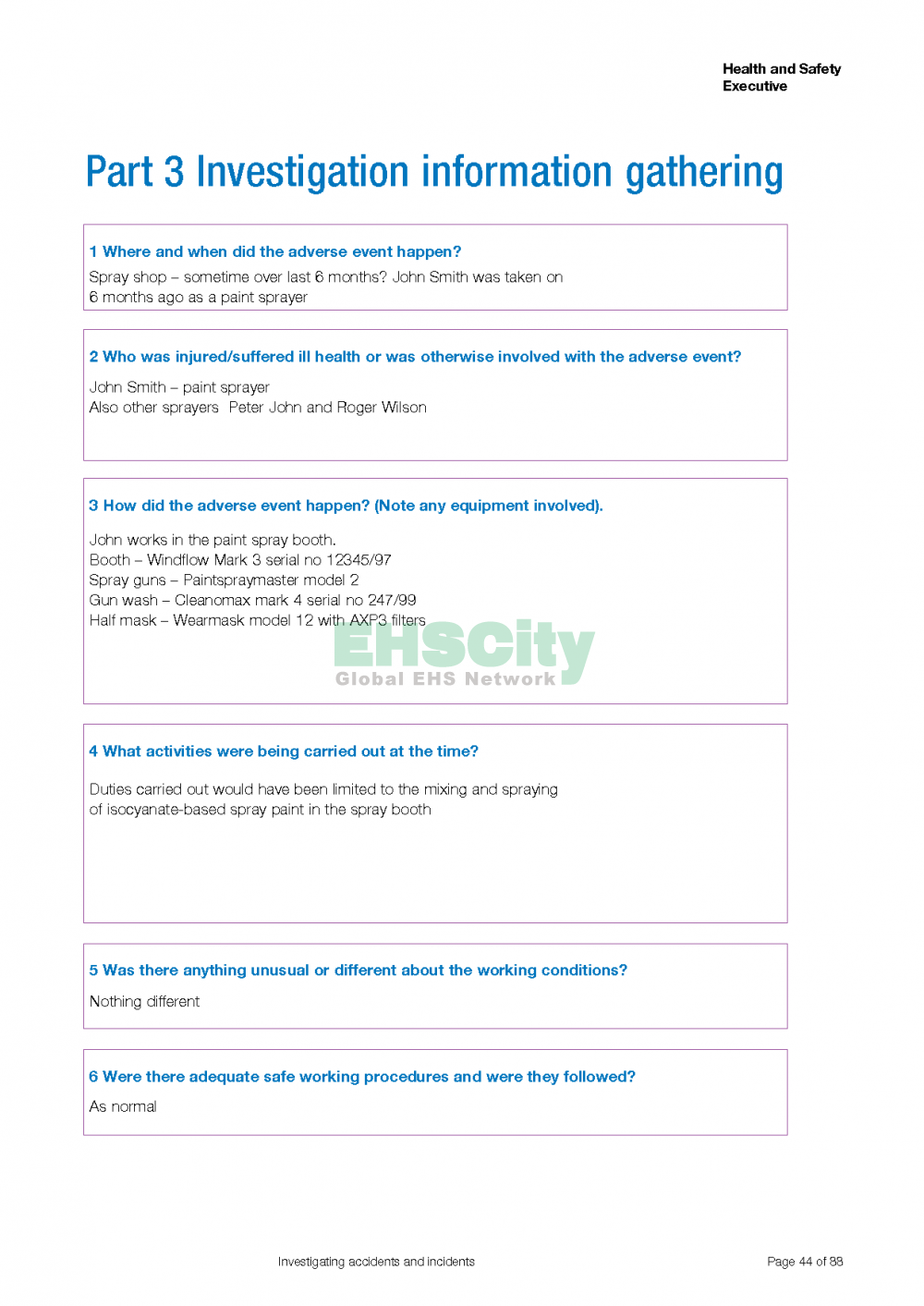 2. Incidents: Here the investigator specifies the physical events, e.g., "Lisa was struck by a load from a moving forklift."