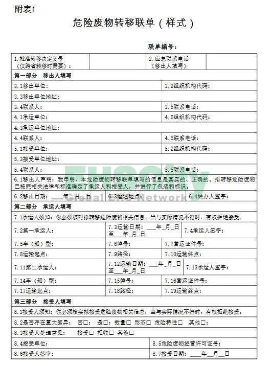 第十三條【轉(zhuǎn)移聯(lián)單】危險廢物轉(zhuǎn)移聯(lián)單相關(guān)信息應(yīng)與信息系統(tǒng)危險廢物管理計(jì)劃中危險廢物產(chǎn)生、貯存、轉(zhuǎn)移、利用、處置等備案信息關(guān)聯(lián)并一致。危險廢物轉(zhuǎn)移聯(lián)單格式見附表1。因特殊原因無法運(yùn)行危險廢物轉(zhuǎn)移電子聯(lián)單時,可先使用紙質(zhì)聯(lián)單,并于紙質(zhì)聯(lián)單辦結(jié)5個工作日內(nèi)在信息系統(tǒng)中補(bǔ)錄電子聯(lián)單。除另有規(guī)定外,禁止運(yùn)輸和接受無危險廢物轉(zhuǎn)移聯(lián)單的危險廢物。