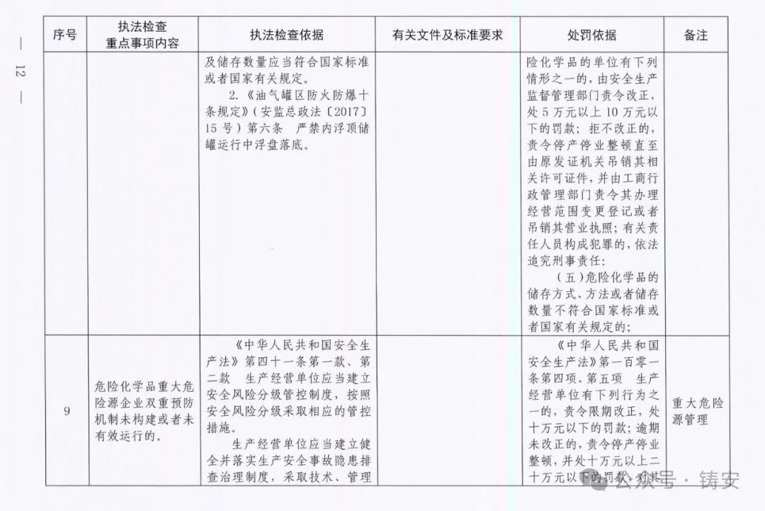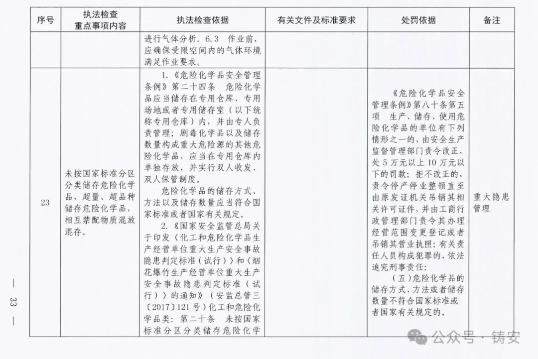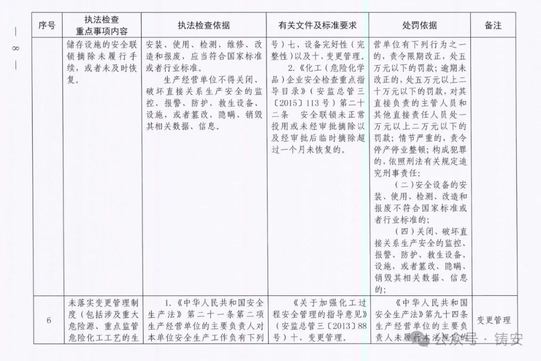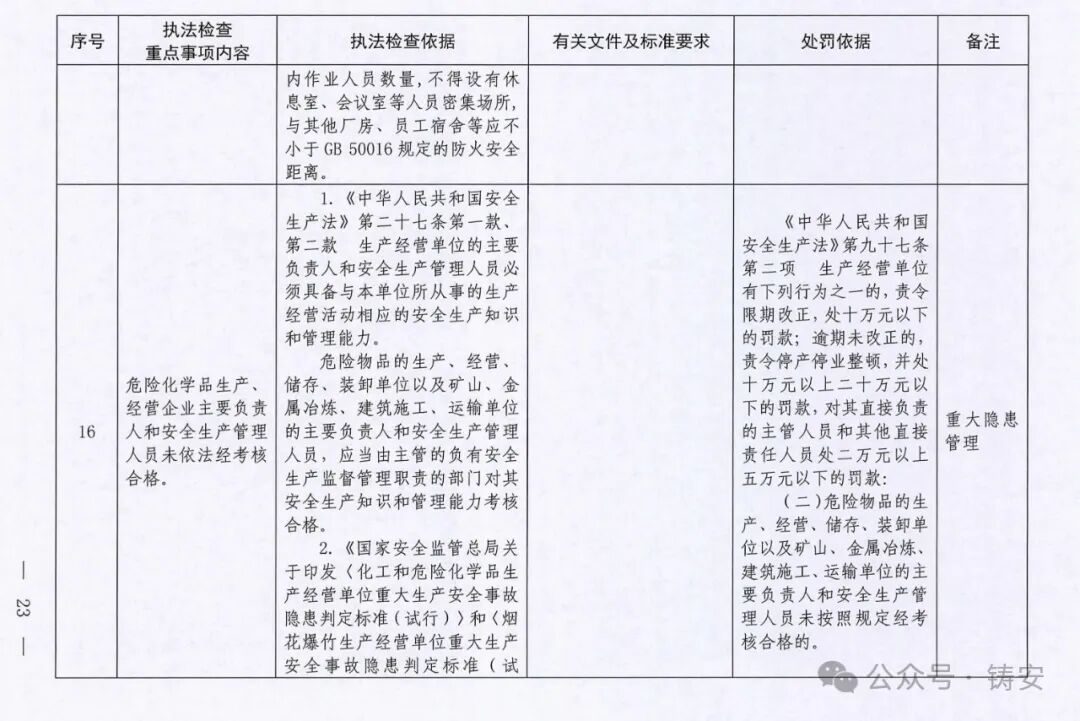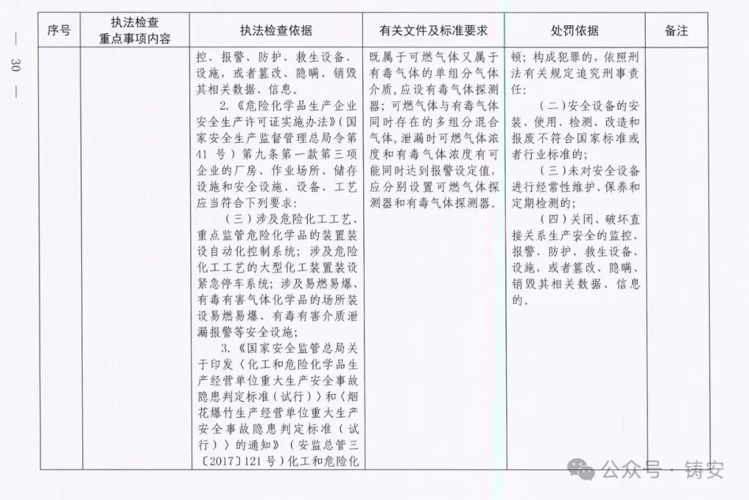 黑應急辦發(fā)〔2024〕32號各市(地)應急管理局:現(xiàn)將《應急管理部辦公廳關于印發(fā)<2024年危險化學品企業(yè)安全生產(chǎn)執(zhí)法檢查重點事項指導目錄>的通知(應急廳〔2024〕11號)》(以下簡稱《指導目錄》)轉(zhuǎn)發(fā)給你們,并提出如下要求,請一并貫徹執(zhí)行。一、提高認識,抓好落實?!吨笇夸洝穱@重大安全風險防控和重大安全隱患排查治理,聚焦關鍵人(企業(yè)主要負責人)、關鍵企業(yè)(涉及重點監(jiān)管危險化工工藝、重點監(jiān)管危險化學品、重大危險源企業(yè))和關鍵環(huán)節(jié)(特殊作業(yè)、雙重預防、報警聯(lián)鎖等),明確了32項重點執(zhí)法檢查內(nèi)容,包括危險化學品安全執(zhí)法檢查重點事項內(nèi)容、執(zhí)法檢查依據(jù)、有關規(guī)范性文件和標準要求以及處罰依據(jù),內(nèi)容明晰,具有很強的指導性。各地要及時傳達到相關企業(yè),并在監(jiān)管執(zhí)法過程中嚴格遵照執(zhí)行。二、結(jié)合實際,提質(zhì)增效。各地要把《指導目錄》作為嚴格公正規(guī)范執(zhí)法的一項重要舉措,對照執(zhí)法檢查重點事項嚴格精準執(zhí)法,特別是要對涉及“兩重點一重大”(重點監(jiān)管危險化學品、重點監(jiān)管危險化工工藝、重大危險源)的危險化學品生產(chǎn)經(jīng)營企業(yè)開展專項執(zhí)法檢查,樹牢“隱患就是事故”風險意識,嚴格安全風險管控和隱患排查治理,嚴防企業(yè)“帶病”運行,進一步推動化工和危險化學品安全生產(chǎn)治本攻堅三年行動各項任務落地生效。三、嚴格執(zhí)法,落實責任。各地要認真學習貫徹習近平總書記關于安全生產(chǎn)的重要指示精神,堅持人民至上、生命至上,針對安全執(zhí)法檢查工作中存在的聚焦重大事故隱患力度不夠、檢查不深入、監(jiān)管執(zhí)法“寬松軟虛”等問題,不斷提升執(zhí)法檢查工作的精準化、規(guī)范化和信息化水平,依法嚴厲查處非法違法行為,強化行刑銜接,全面提高對非法違法企業(yè)的執(zhí)法震懾力。四、加大培訓,精準指導。各地要按照有關法律法規(guī)規(guī)定,針對執(zhí)法檢查重點事項,結(jié)合本地區(qū)實際和年度安全生產(chǎn)監(jiān)督檢查計劃,強化執(zhí)法效能。要適時通報執(zhí)法檢查情況,剖析發(fā)現(xiàn)的重點問題和共性問題,嚴格落實問題督辦整改制度,推動從根本上消除事故隱患、從根本上解決問題。要通過嚴格執(zhí)法引導推動企業(yè)主動落實安全生產(chǎn)主體責任,有效防范化解重大安全風險,不斷提升本質(zhì)安全水平。聯(lián)系人:馬冀、馬冰心,聯(lián)系電話:0451-87019598。附件:應急管理部辦公廳關于印發(fā)《2024年危險化學品企業(yè)安全生產(chǎn)執(zhí)法檢查重點事項指導目錄》的通知(應急廳〔2024〕11號)黑龍江省應急管理廳2024年3月14日